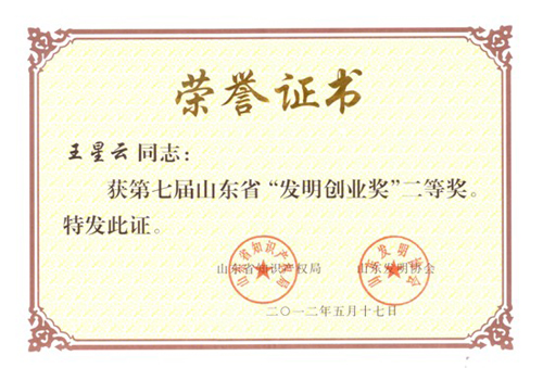王星云董事長榮獲山東省“發(fā)明創(chuàng)業(yè)獎(jiǎng)”二等獎(jiǎng)
