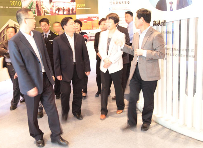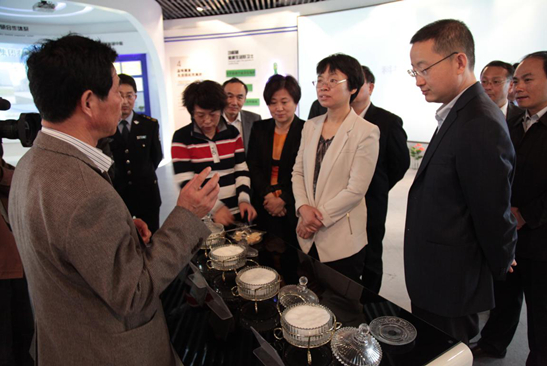 (上圖:馬越男局長(中)在展廳展臺前駐足聽取公司董事長王星云產(chǎn)品情況介紹)