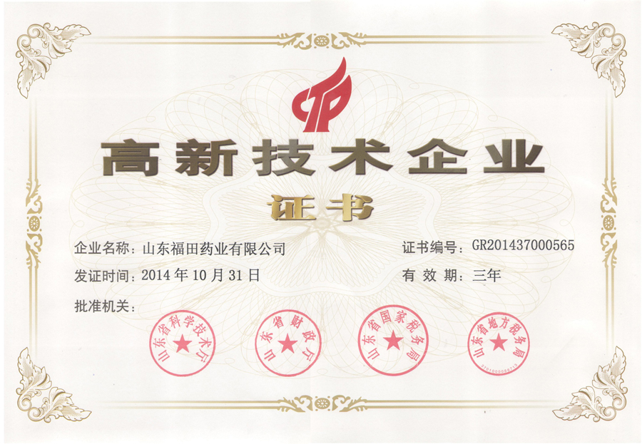 近日,我集團旗下山東福田藥業(yè)有限公司獲得了山東省科學(xué)技術(shù)廳、山東省財政廳、山東省國家稅務(wù)局、山東省地方稅務(wù)局聯(lián)合頒發(fā)的高新技術(shù)企業(yè)證書。福田藥業(yè)再度被認定為國家高新技術(shù)企業(yè),繼續(xù)享受稅收減免等一系列相關(guān)優(yōu)惠政策。