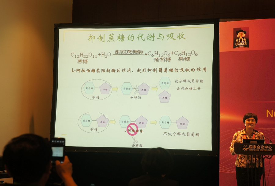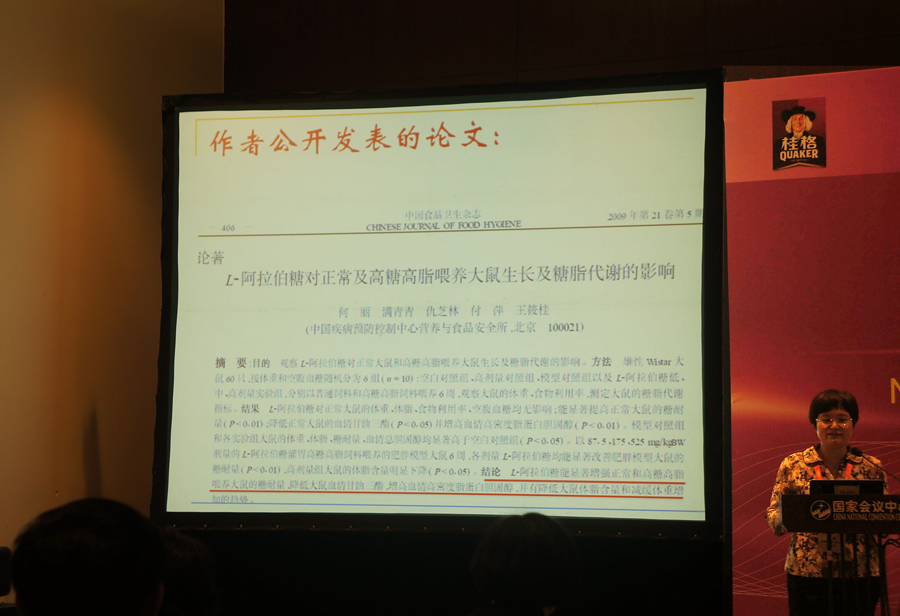 何麗研究員還現(xiàn)場發(fā)布了其2009年發(fā)表于《中國食品衛(wèi)生雜志》上《L-阿拉伯糖對正常及高糖高脂喂養(yǎng)大鼠生長及糖脂代謝的影響》的論著。實(shí)驗最終結(jié)論:L-阿拉伯糖能顯著增強(qiáng)正常和高糖高脂喂養(yǎng)大鼠的糖耐量,降低大鼠血清甘油三酯,增高血清高密度脂蛋白膽固醇,并有降低大鼠體脂含量和減緩體重增加的趨勢。對L-阿拉伯糖改善糖脂代謝紊亂的功能予以肯定。