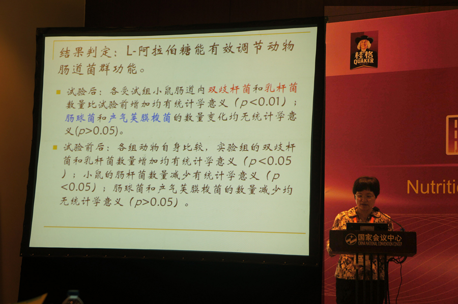 何麗研究員從L-阿拉伯糖的化學(xué)結(jié)構(gòu)、生理功能、抑制蔗糖代謝與吸收原理等方面對L-阿拉伯糖進(jìn)行了介紹,并詳細(xì)講解了其所做L-阿拉伯糖調(diào)節(jié)腸道菌群功能動物實(shí)驗研究的試驗過程及結(jié)果。通過比較實(shí)驗前后小鼠自身及組間雙歧桿菌、乳桿菌、腸球菌、腸桿菌和產(chǎn)氣莢膜梭菌的變化情況,結(jié)果判定:L-阿拉伯糖能有效調(diào)節(jié)動物腸道菌群功能。