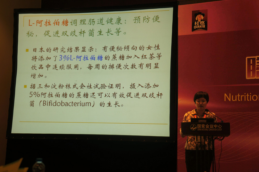 何麗研究員在報告中同時引用了日本對L-阿拉伯糖的研究結(jié)果。日本研究結(jié)果顯示:有便秘傾向的女性將添加了3%L-阿拉伯糖的蔗糖加入紅茶等飲品中連續(xù)服用,每周的排便次數(shù)有明顯增加。據(jù)三和淀粉株式會社試驗證明,攝入添加5%L-阿拉伯糖的蔗糖還可以有效促進(jìn)雙歧桿菌的生長。對L-阿拉伯糖調(diào)節(jié)腸道菌群的功能給予充分肯定。