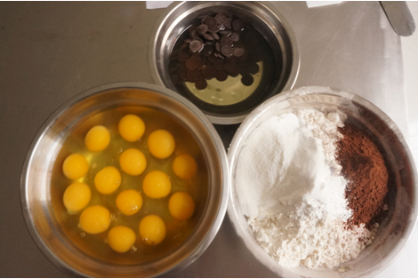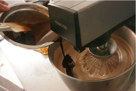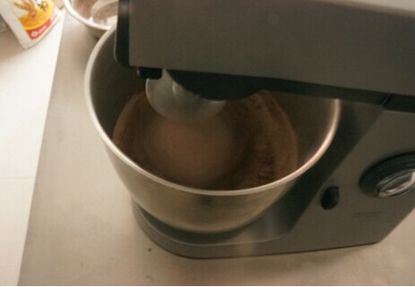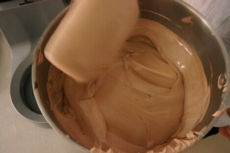 5、將巧克力和液體油分次加入打發(fā)后的蛋液中,慢速攪勻。