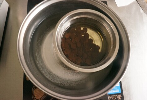 4、巧克力與液體油隔水加熱融合后攪拌均勻備用。