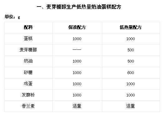 麥芽糖醇在體內幾乎不分解,所以可用做糖尿病人、肥胖病人的食品原料。現例舉低熱量奶油蛋糕配方如表一。