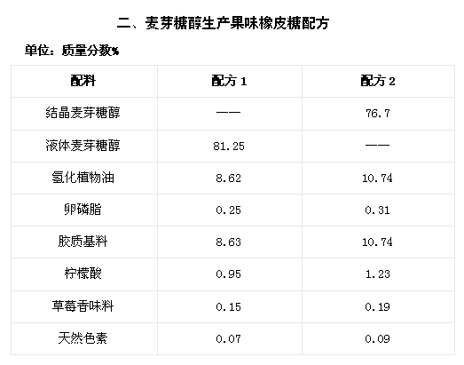 由于麥芽糖醇的風味口感好,具有良好的保濕性和非結晶性,可用來制造各種糖果,包括發(fā)泡的棉花糖、硬糖、透明軟糖等,F例舉麥芽糖醇制造糖果配方如表二。